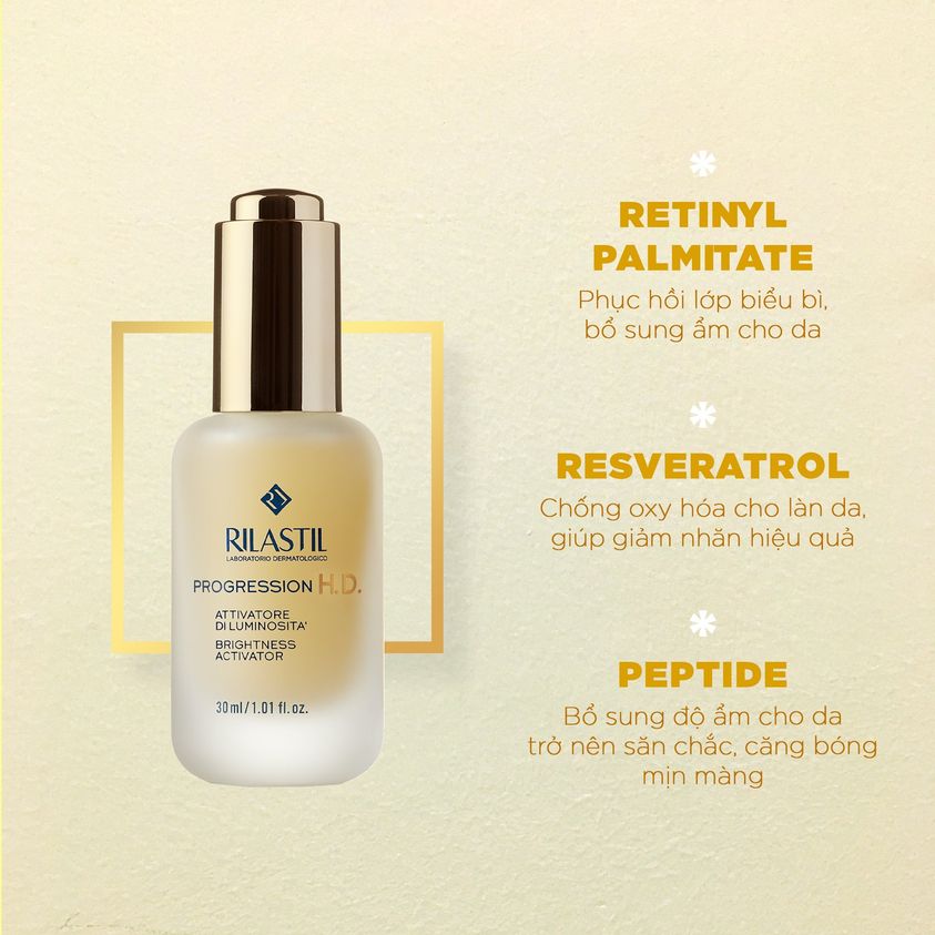 Trải nghiệm tinh chất Rilastil Progression HD Brightness Activator Serum với sự kết hợp tinh hoa giữa công nghệ đột phá và các hoạt chất vàng trong làng chống lão hóa:
